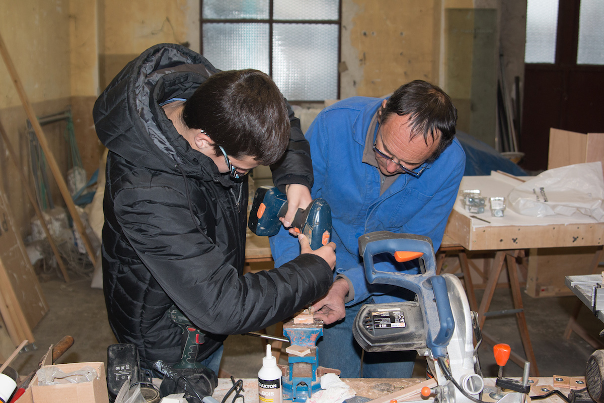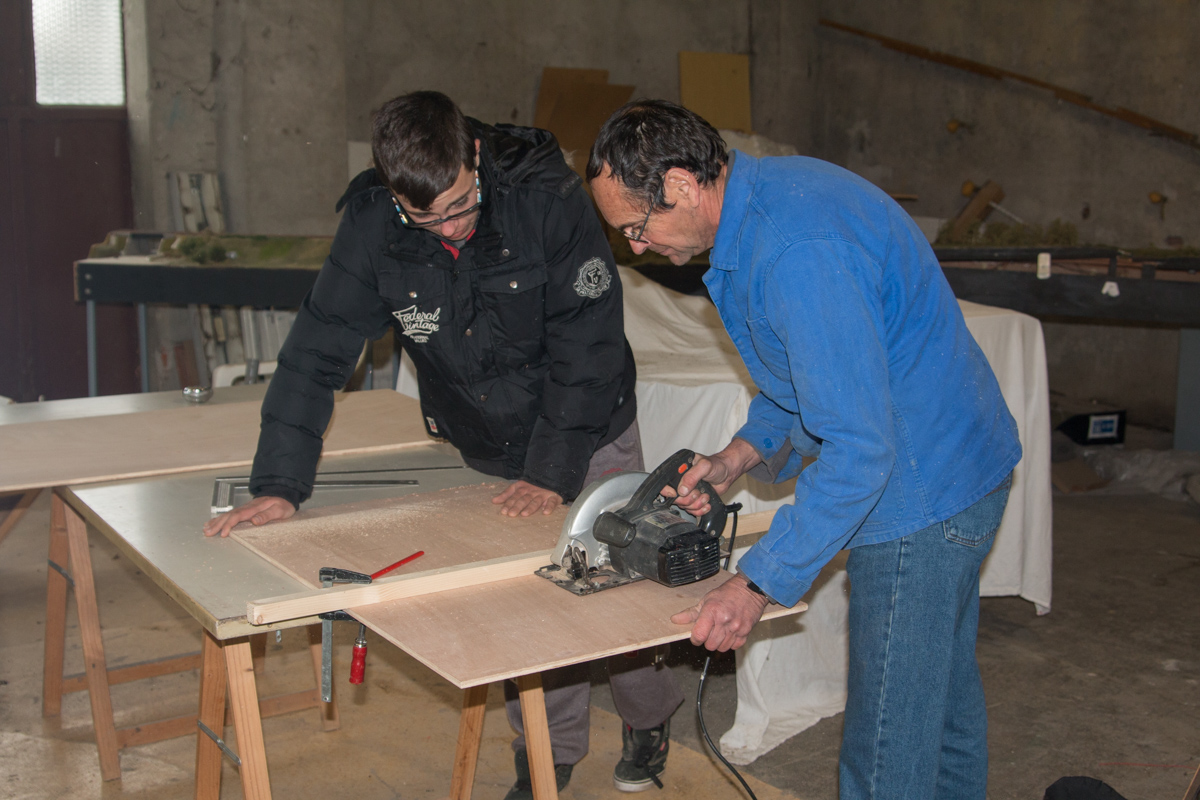 Michel découpe les planches de contreplaqué à la scie circulaire
