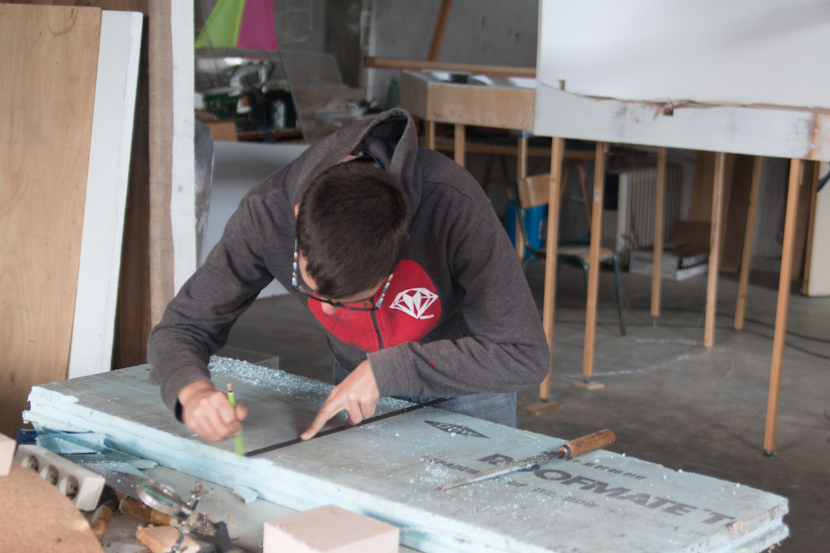 Rémi reporte sur la planche de polystyrène les mesures prises sur son Modulino.