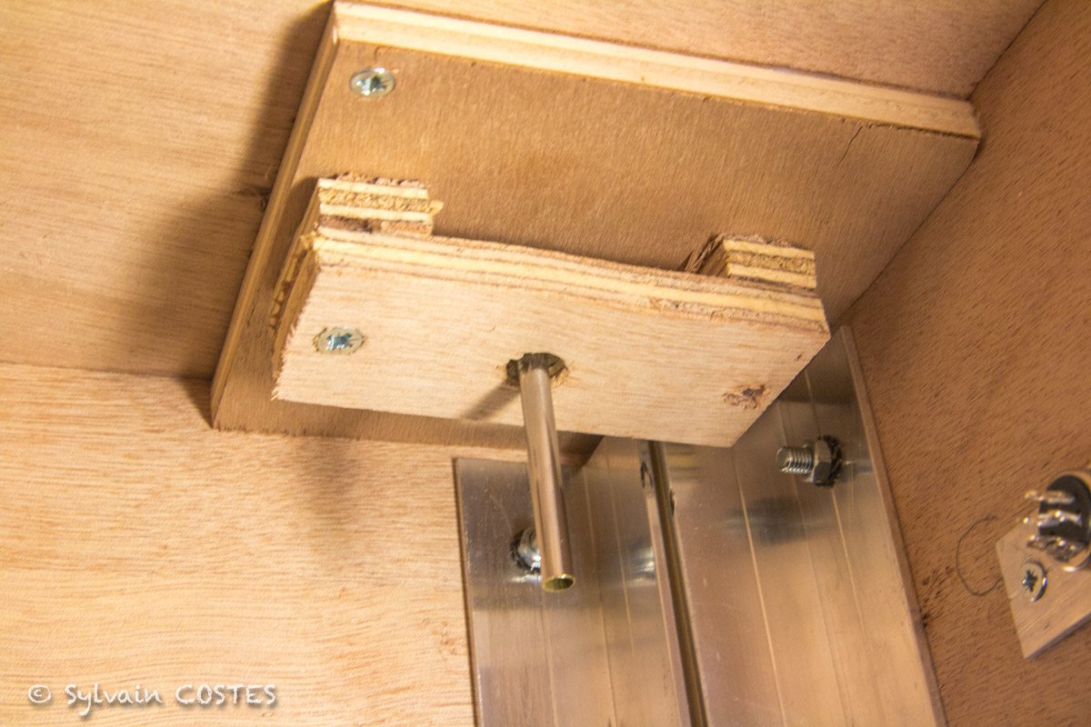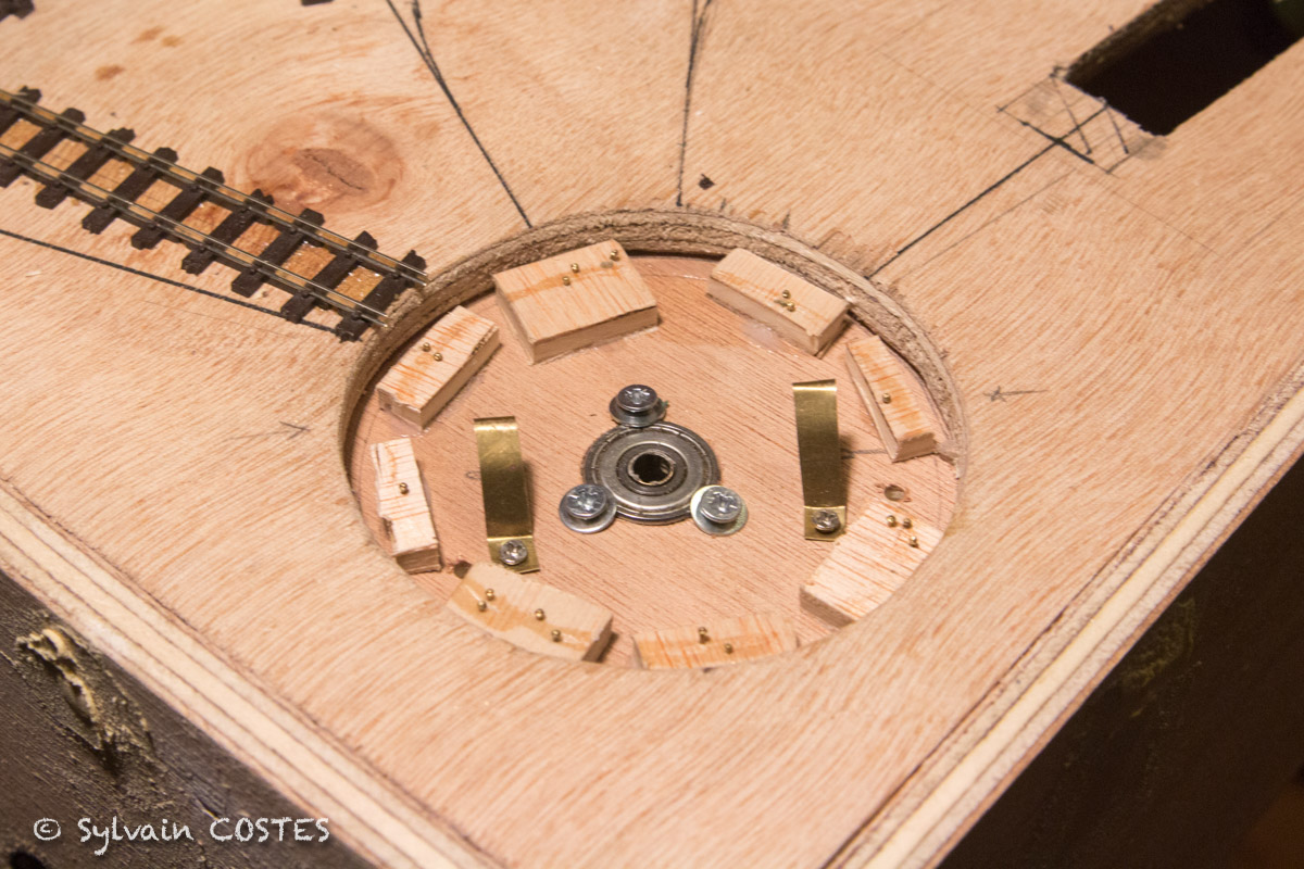 La plaque prend place dans une fosse taillée dans le plateau du réseau. Deux roulements à billes assurent une bonne rotation de l'axe et un petit motoréducteur se charge du mouvement.