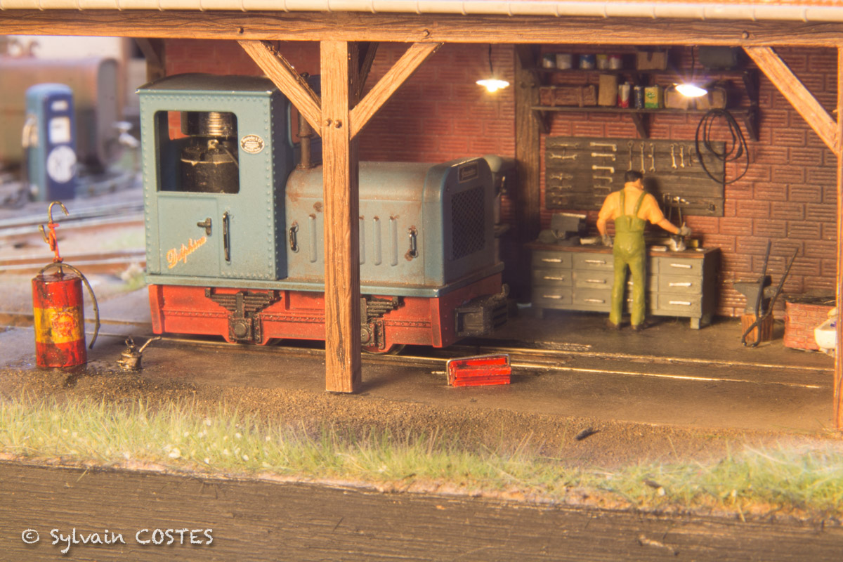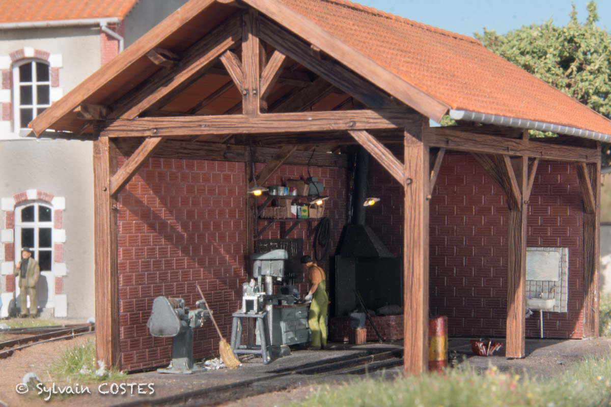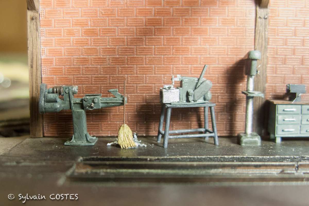 L'atelier des locotracteurs est au premier plan, il faut donc soigner son aménagement. Il est agrémenté par quelques machines outils confectionnées en carte plastique: tour, étau limeur, perceuse à colonne, forge, établi, étau...
