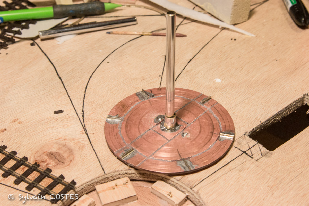 D'un côté j'ai soudé les rails, de l'autre j'y a mis un axe en tube de laiton et deux lamelles de contact pour assurer la continuité du courant jusqu'aux rails.