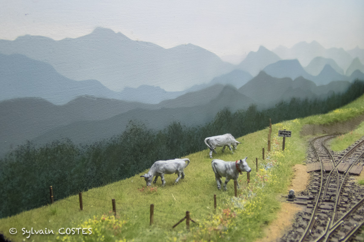 Lors des expositions avec les Croisés de l'Etroit, le réseau doit être visible de tous les côtés, mais en fonctionnement autonome avec sa coulisse, je lui installe un fond de décor. Etant sensé se trouver au pied des Pyrénées, le décor se devait de montrer ces montagnes telles qu'elles sont visibles depuis les alentours de St Gaudens. Le dégradé des sommets est fait de couches successives de plus en plus foncées appliquées à l'aérographe sur des pochoirs découpés d'après photos pour restituer fidèlement des sommets réels.