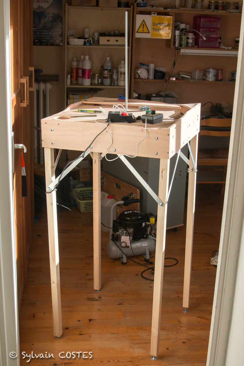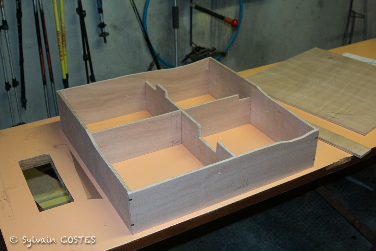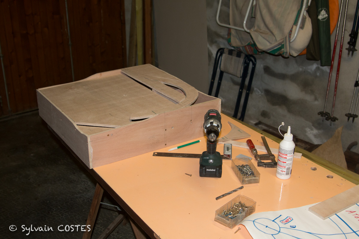 La structure est faite en contreplaqué de 10mm. Deux renforts en croix assurent une grande rigidité et serviront de support à la tige filetée creuse qui soutiendra le plafond et l'éclairage.