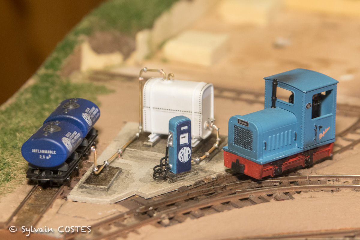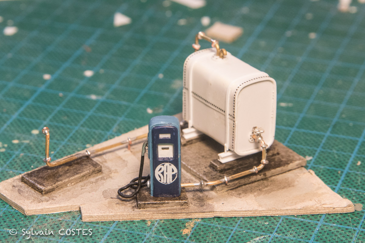La station service est des plus basiques. Une surface bétonnée (faire en carton épais) reçoit une bouche de dépotage, une cuve faite maison en carte plastique et une pompe de distribution issue d'un très vieux kit Jouef.