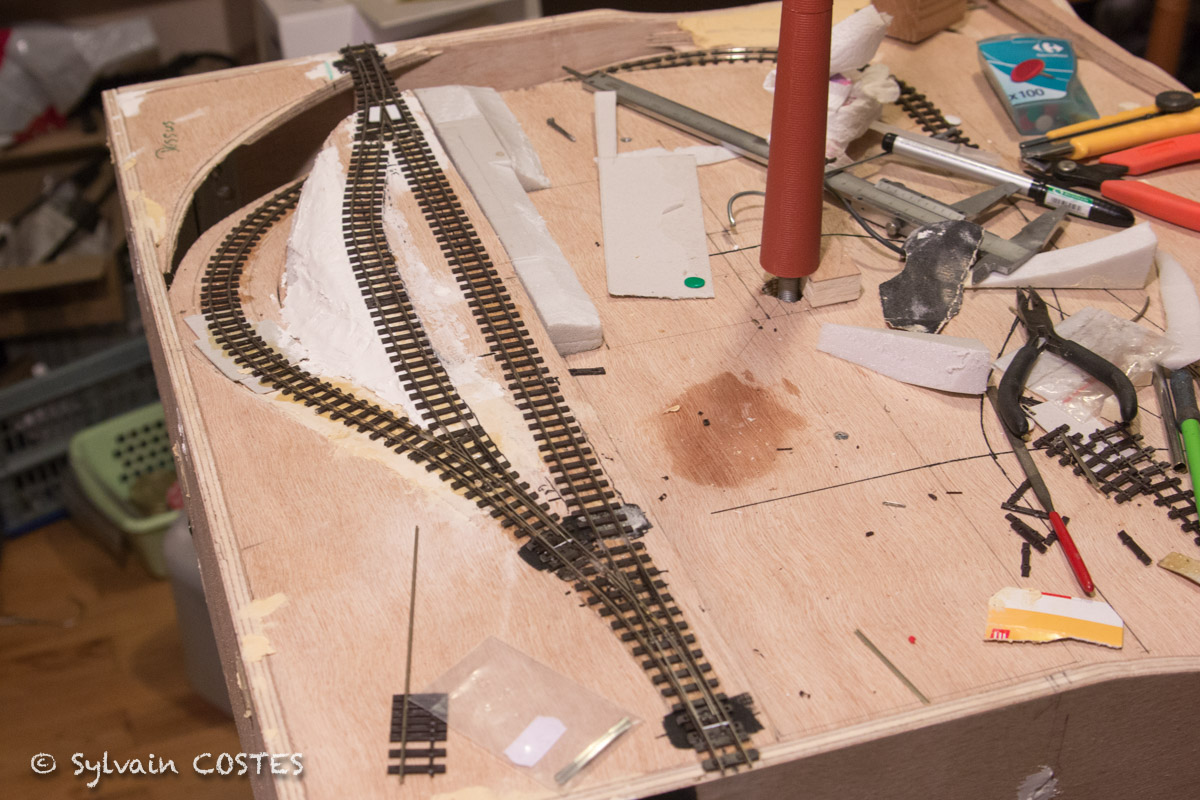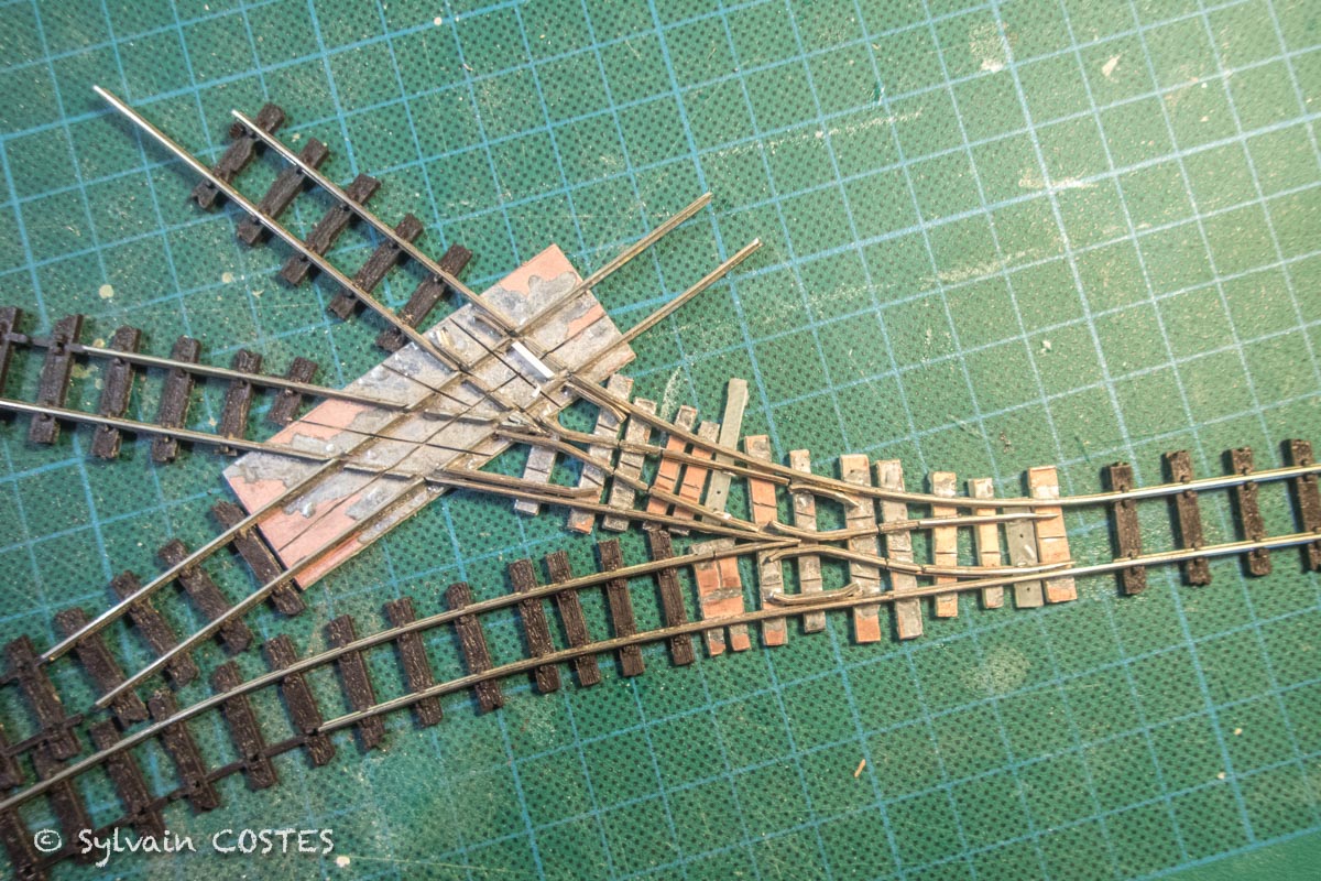 Les appareils de voie du commerce sont bien trop grands pour que puisse en loger. Il me faut donc construire toutes mes aiguilles, dont un enchevêtrement de deux aiguilles consécutives traversées par deux croisement...