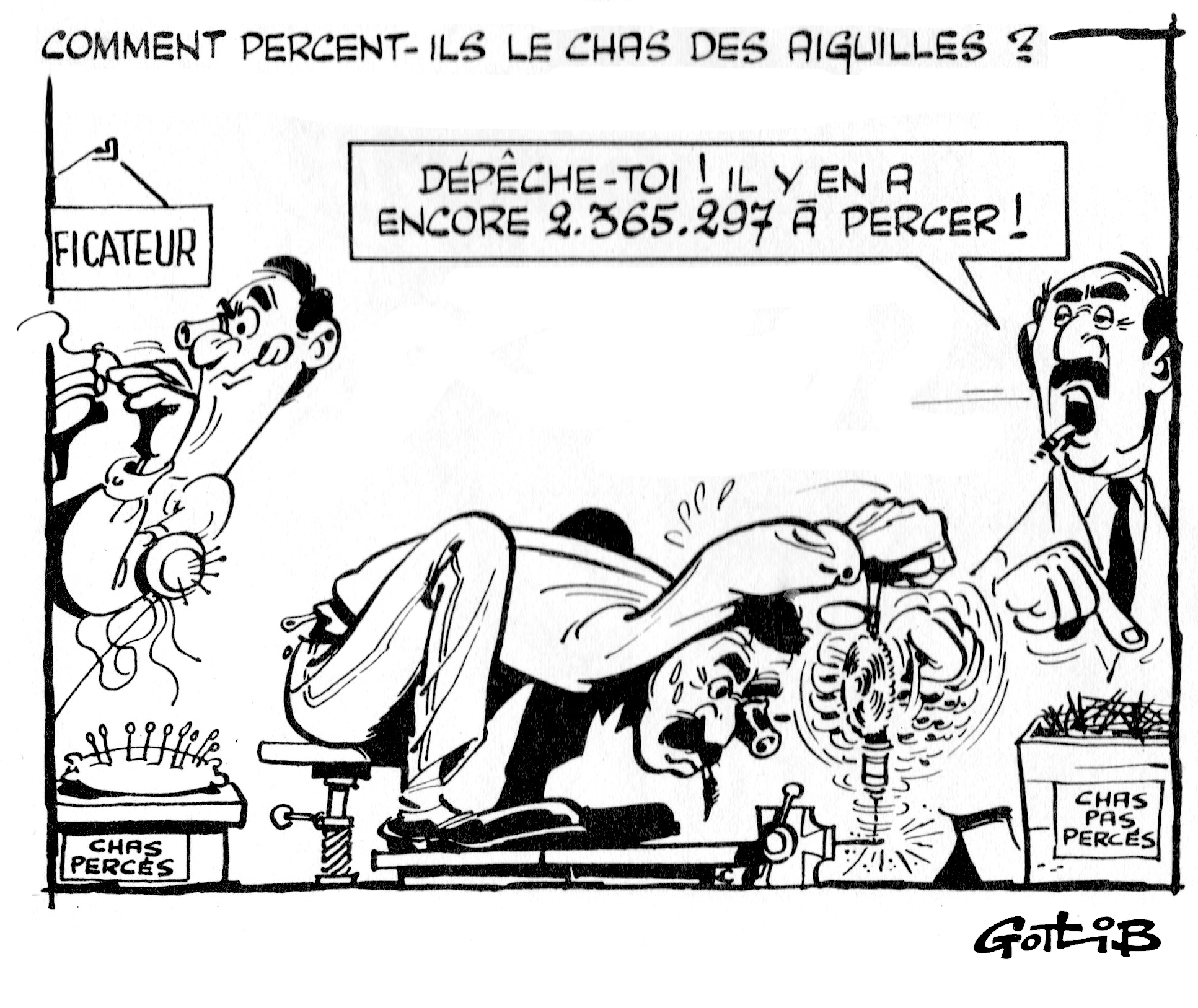 Il s'agit donc d'une ligne sur laquelle s'embranche une usine. Inspiré par un dessin de Gotlib, ce sera une usine de perçage de chas d'aiguilles.
